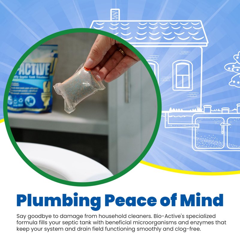 - PLUMBING SAFE - Bio-Active septic tank pods tackle household waste buildup. Say goodbye to damage from household cleaners. Our septic packets offer safety for septic tanks and plumbing systems.