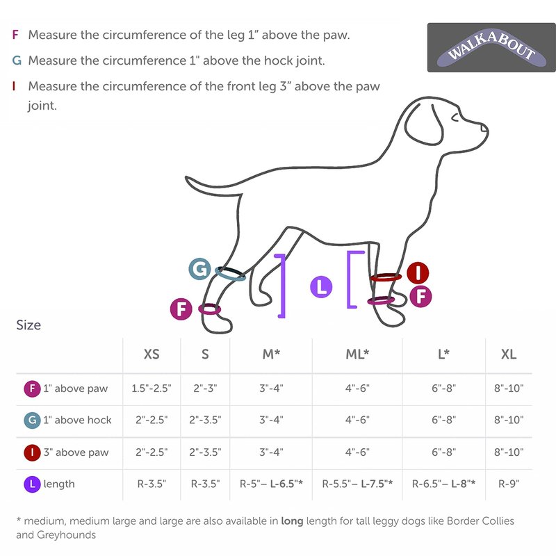 - Fits leg size 3"-4" length is 6" measure circumference 2" above the paw.