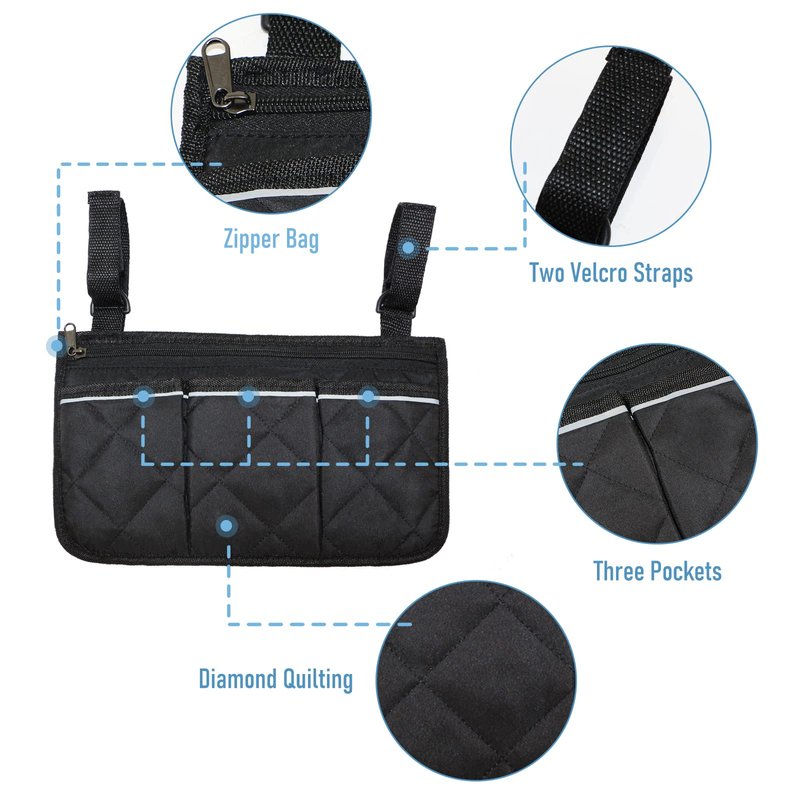 Walker Organizer Pouch - Durable Walker Bags for Folding Walker with Three Wide Cotton Interlayer Pockets, Lightweight Wheelchair Bags for the Armrest, Rollator, Two Adjustable Velcro Straps, Black