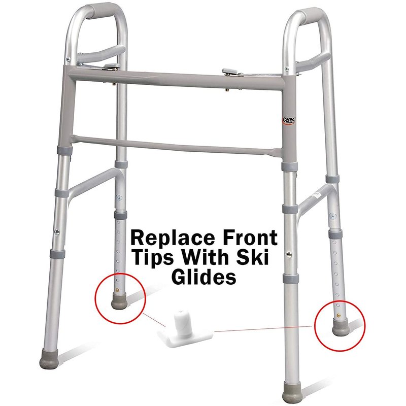 The Carex Walker Ski Glides allows your walker to move smoothly over most surfaces both inside and out. Made of durable plastic, these ski glides are an attractive addition to your walker while providing you the ability to get around more easily!