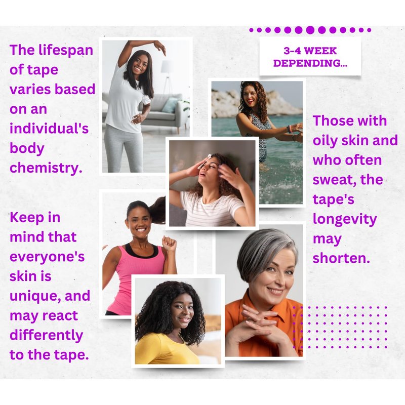- 【DURATION AND FINISH OF TAPE ADHESIVES】: The longevity of tape adhesives varies depending on the individual's body chemistry. The tape can last up to three weeks, but it may not hold as long for those with oily skin or if they perspire frequently. Additionally, the finish of the tape is typically matte.
