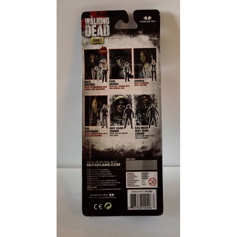 McFarlane toys joins forces once again with AMC to create revolutionary collectible figures from the network’s hit series, ‘The Walking Dead.” The small-town sheriff’s turned-hero and leader of the survivors during the zombie apocalypse, Rick continues to struggle with his moral convictions in season two. Rick is depicted in a brand-new sculpt in his civilian attire, prevalent in season two. Figure features interchangeable hands to hold multiple weapons, along with 14 points of articulation. Additional accessories include removable revolver, rifle with strap, and animal control stick for zombie catching.