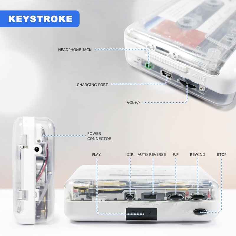 - 【Clear Stereo&Auto-reverse】This portable cassette player use stereo high quality cassette head, stereo playback, the sound quality is better。Besides,this cassette player has an auto-reverse function that allows you to quickly flip the tape using the "DIR" button and reverse it once or an unlimited number of times using the left or right "Play Mode" button