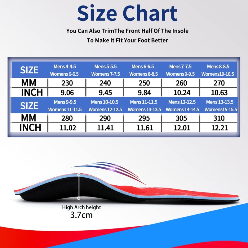 - *[ Three-point Mechanics Design ] - Featuring strong arch support, deep U heel cup, and metatarsal pad support massage relieve foot pressure and fatigue. Walkomfy Orthotic Insoles are perfect for helping to correct over-pronation (inward rolling of the ankle/foot), high arch, flat feet and fallen arches.