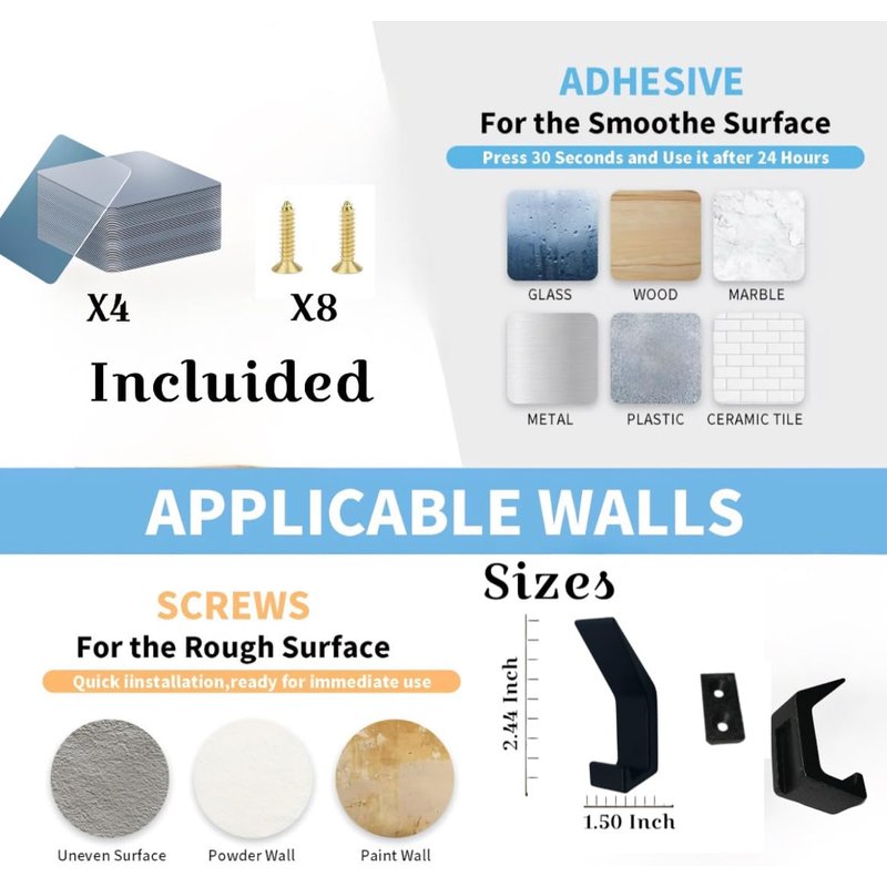 - VERSATILE MOUNTING: Self-adhesive and screws hooks with strong construction, perfect for hanging towels, robes, and kitchen accessories in bathrooms or kitchens
