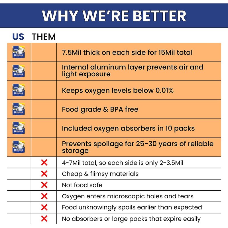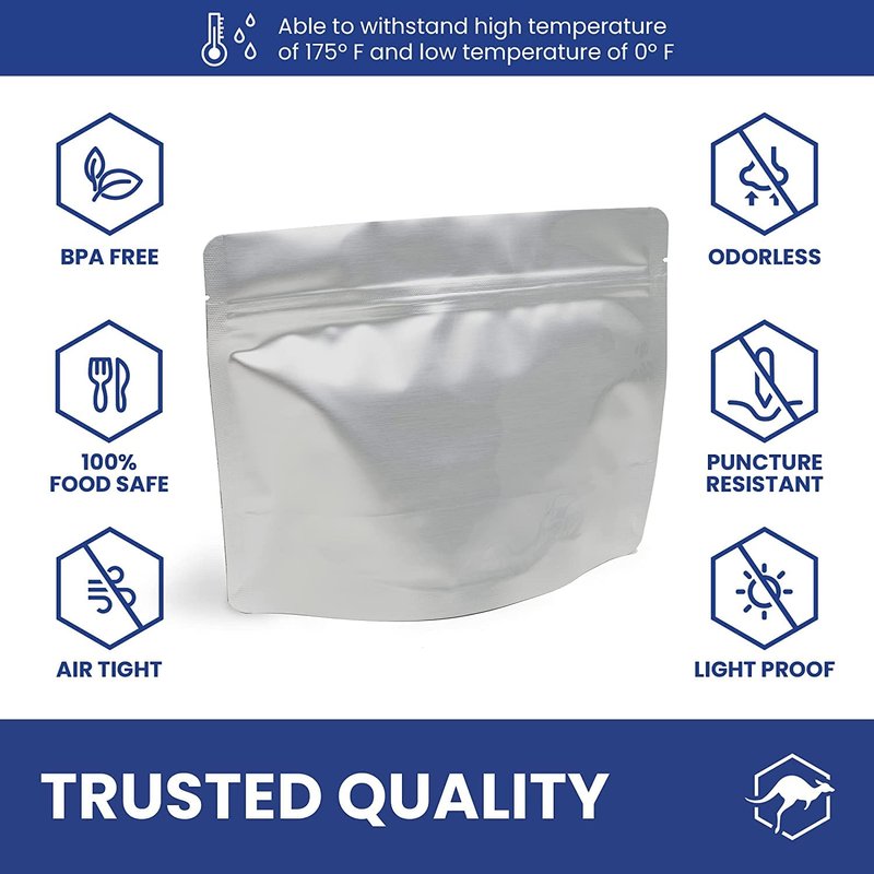 - MAXIMUM PROTECTION - An added internal layer of aluminum provides superior durability and puncture resistance to keep air and moisture out and the food inside fresh. BPA-free, food-grade Mylar is heat sealable above the zipper to lock out air.