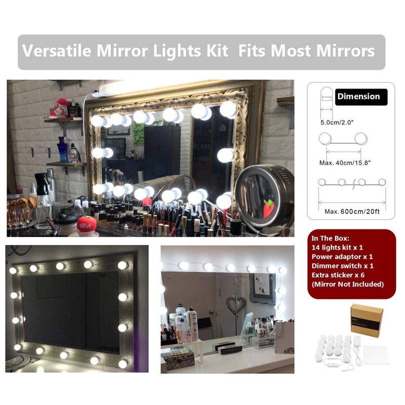 - FIT MOST MIRRORS - At a max. length of 20FT/6M and adjustable wires, this plug-in vanity lighting fixture will fit most makeup mirrors. Peel and stick, plug and play, it only takes a few minutes to set up your own Hollywood light-up vanity! The patented Rotate-To-Hide design and transparent wires can make your lighted makeup mirror present a beautiful and neat appearance. Mirror is not included.