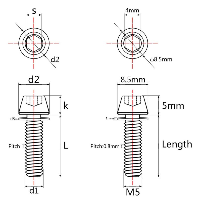 - 【About the product specifications】 Size:M5x20mm; Thread Diameter: 5mm/0.196inch; Thread Pitch : 0.8mm; Hex Wrench Size : 4mm(DIN912 standard); Bolt Head Diameter:8.5mm/0.335inch; Bolt thread length: 20mm/0.79inch(Not including head height); Weight : About 2.3g/Piece.
