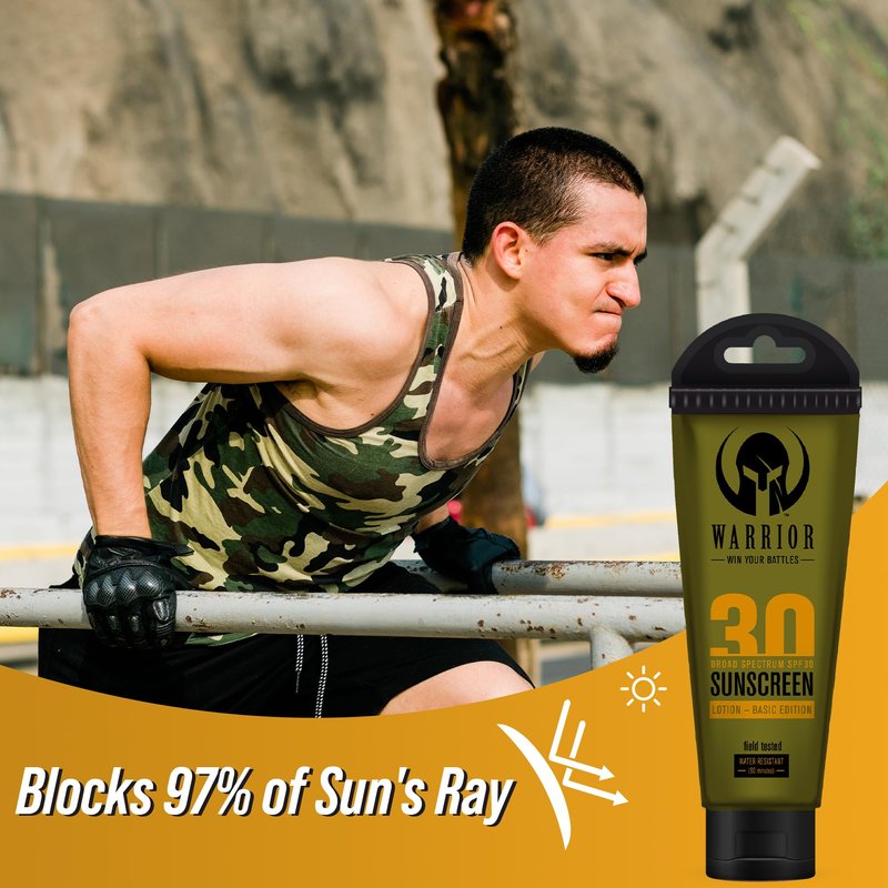 Warrior Sunscreen SPF 30 Lotion - Water & Sweat Resistant Body Lotion with SPF - TSA Compliant, Non-Mineral Formula, Camo Presentation, Biodegradable, Broad Spectrum Sunscreen SPF30 - (3 Oz)