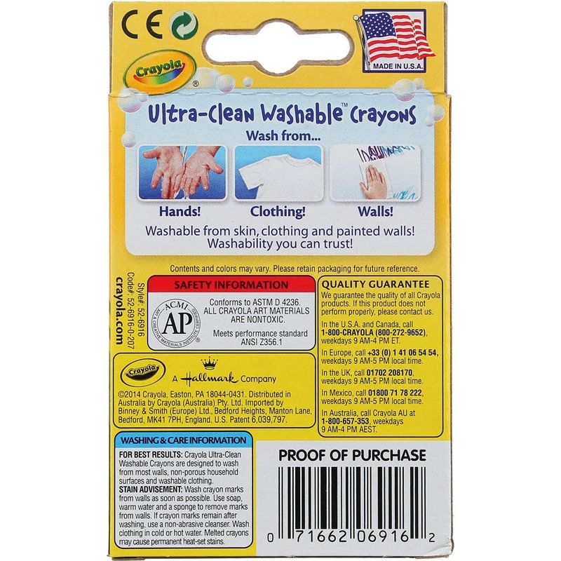 Crayola Crayons of regular size can be wiped off from most nonporous surfaces with warm water and a sponge. Ultra Clean Washable Crayons are specially formulated to easily wash off most surfaces, including skin, clothing, tabletops and even painted walls. If your child ventures off the paper, you can quickly clean it up with a sponge and warm water. Great for small children just learning to color and draw, these crayons are especially easy to use. They are designed to go on smoother for easier laydown, delivering bright colors and making coloring more enjoyable for young children. The pointed crayon tip makes it easier for children to write and draw with accuracy and have more control when writing numbers or letters. Crayons are nontoxic. Washes off clothing, upholstery, walls, and other surfaces. Regular size. 8 assorted colors - Black, Blue, Brown, Green, Orange, Red, Violet, Yellow. Crayon Size: 3 5/8 x 5/16". Brilliant colors and smooth color laydown. Reformulated colors provide more intense hues and truer colors. Easy blending without smudging. Resistance to bending and breaking. Safe and certified nontoxic. AP Certified nontoxic.