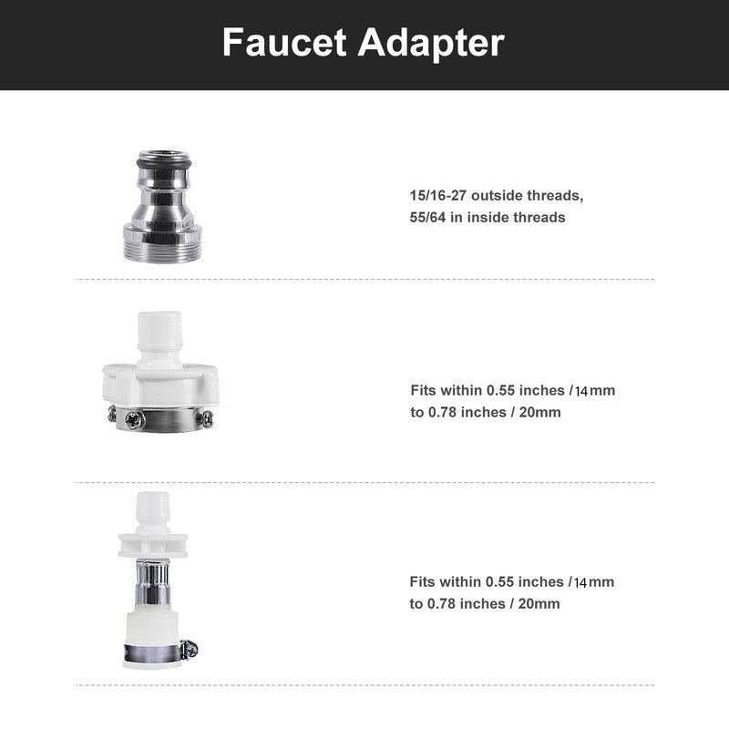 - 【2 Faucet Adapters】One adapter is designed for the Cylindrical interface with a diameter between 0.55 inch/14mm and 0.78 inch/20mm while the other adapter (internal thread sized 55/64 inch/22mm and external thread sized15/16 inch/24mm) is to connect the water Sink faucet with your washing machine.