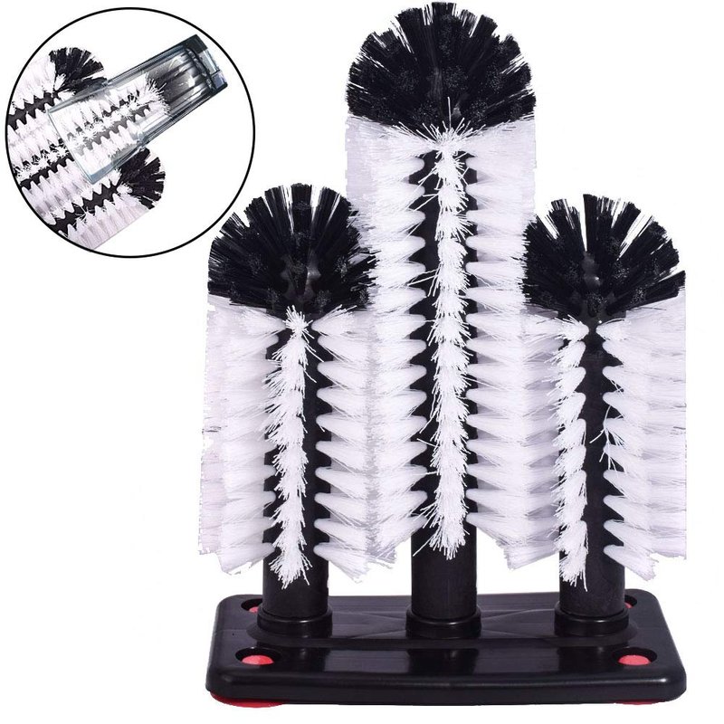 Water Bottle Cleaning Brush Glass Cup Washer with Suction Base 3 Head Bristle Brush for Beer Cup, Long Leg Cup, Red Wine Glass and More Bar Kitchen Sink Home Tools