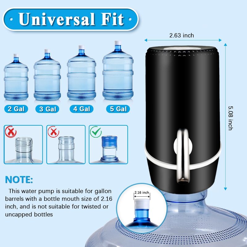 - [High Compatibility, More Flexible] - Our water dispenser is compatible with many types of water bottles,including those with 2.16-inch screw caps or crown caps.This is a universal water dispenser pump,suitable for water bottles with various capacities such as 1.5L, 5.7L, 10L, 11.3L, 15L, 18.9L, etc.,making your use more flexible and convenient.