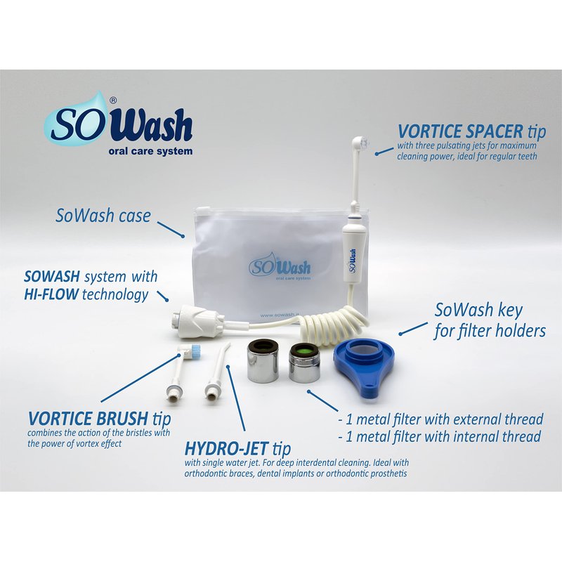 The Trio package will allow you to use the SoWash hydropulser in all its versatility and potential thanks to the 3 included diverse tips: Vortice Spacer - with three pulsating jets that converge at the same point, creating a vortex effect that can remove even the most difficult residue; Waterjet - with a single linear waterjet for a precise and deep cleaning; Vortice Brush - combines the action of bristles with the power of a vortex effect for a complete dental cleaning. Includes the Hi-flow System for better control of water pressure. Package contains: n.1 SoWash system; n.1 Vortice Spacer tip; n.1 Vortice Brush tip; n.1 Hydro-jet tip with single water jet; n.1 metal filter with external thread; n.1 metal filter with internal thread; n.1 SoWash case; n.1 key to unscrew filters. n.1 Multi-language manual.