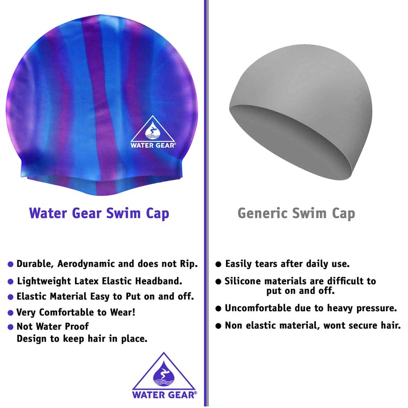 Introducing the Water Gear Synthetic Fiber Swim Cap - Your Ultimate Comfort and Durability Solution for Swimming! Dive into the world of swimming with the Water Gear Synthetic Fiber Swim Cap, the perfect companion for all your aquatic adventures. Whether you're a seasoned swimmer or just dipping your toes in the water, this swim cap promises an unparalleled experience that combines comfort, durability, and functionality. Say goodbye to uncomfortable swim caps that leave you distracted during your swim. Our swim cap boasts a lightweight design that ensures maximum comfort without compromising on performance. The elastic fiber and unique stretch offer a snug fit that keeps water out, so you can focus solely on perfecting your strokes. Unlike traditional rubber and silicone swim caps, our large swim cap crafted from high-quality lycra material effortlessly conforms to the unique shape of every head. Enjoy a secure, personalized fit every time you hit the water. The Water Gear Synthetic Fiber Swim Cap is engineered to outlast traditional silicone and rubber caps, providing you with reliable performance for years to come. Simply ensure proper drying after each use, and this neon wonder will remain your swimming companion for countless aquatic escapades. Tired of dealing with tangled and knotted hair after swimming? This swim cap material is a game-changer. Unlike sticky silicone caps, our synthetic fiber cap will not cling to your hair, making it a breeze to put on and remove without any unwanted hair-pulling. If you're a competitive swimmer, this cap will be your ultimate secret weapon. Compatible with silicone swim caps, our swimming cap for women with long hair allows you to enjoy enhanced comfort and peak performance during competitions. Are you ready to elevate your swimming experience to new heights? Experience unmatched comfort, durability, and hair protection with the Water Gear Synthetic Fiber Swim Cap. Dive in today and enjoy the freedom to swim without limits!