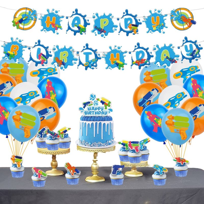 Water Gun Birthday Party Supplies Pool Birthday Party Supplies Set Water Gun Theme Birthday Party Decorations Include 1 Banner 1 Cake Topper 16 Balloons 24 Cupcake Topper