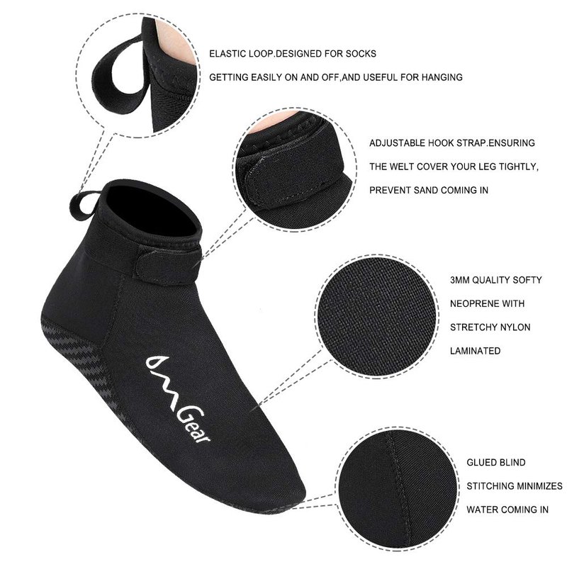 - 【SKIN-FRIENDLY 3MM NEOPRENE SOCKS】 OMGear neoprene water socks made by 3mm quality&softy neoprene with 4-way stretchy nylon laminated,which is healthy,elastic and durable,can last long even frequent use and protect your feet from cut,puncture,scratch and cold water.