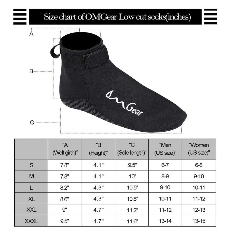 OMGear neoprene socks is unisex designed,fit for both women and man.Sizes range from US 6 to US 15.