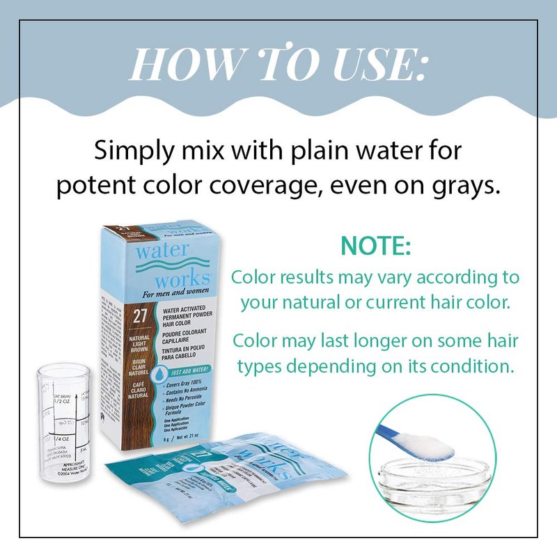 - LESS EFFORT ON HAIR COLORING: The uses are limited only by your imagination! The Water Works Powder Permanent Hair Color in Light Brown is packed in a handy .21-ounce box, that will let you cover a wider area faster and with less effort. Simply add water, mix and apply to clean dry hair, allow to process according to package instructions based on the level of shade you wish to achieve and you are good to go!