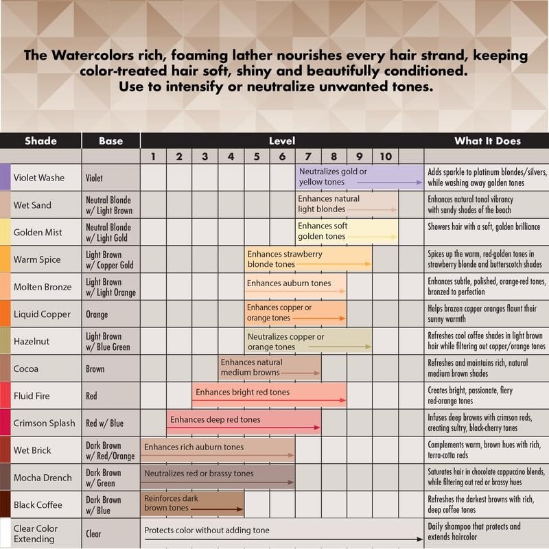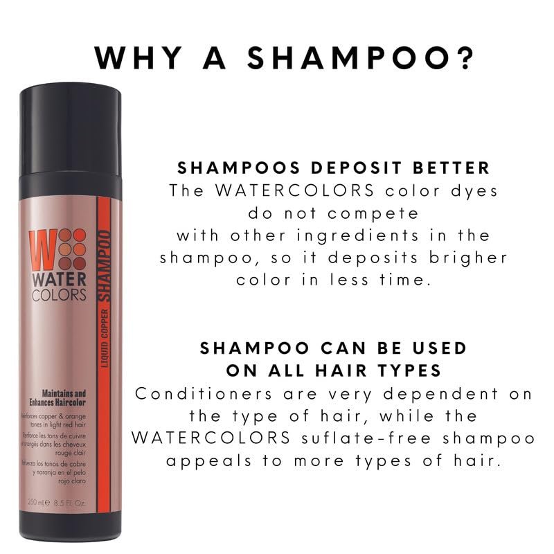 - What Makes Watercolors Shampoos Unique? 3-in-1 Color Depositing Shampoo - Cleanses, Conditions and Refreshes Color: Replace the color that has faded from your hair. Intensify while cleansing and conditioning with every wash. Restore and Rejuvenate color treated hair in one wash