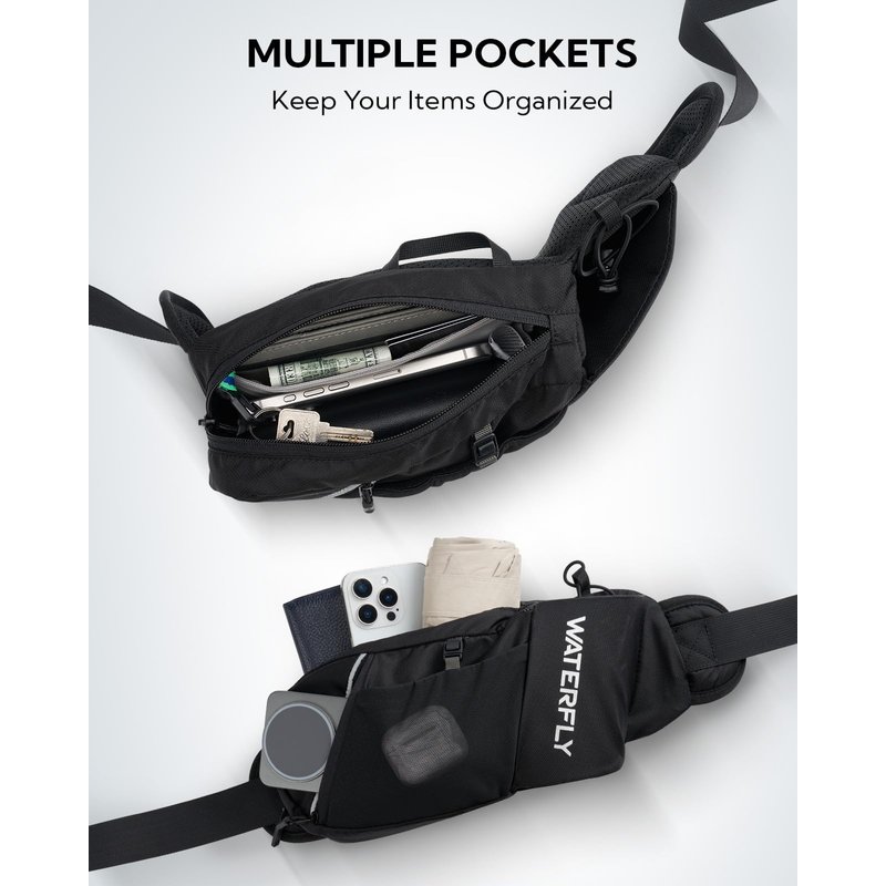 WATERFLY Water Bottle Holder for Running, Hydration Belt Pouch for Runner Hiker Exerciser High Quality Material: Nylon Breathable Backplane: The backplane is made of breathable mesh material that does not get stuffy keep you comfortable. Structure of Large Waist Bag 1. A water bottle holder: Expandable to accommodate 18 oz/500 ml water bottles, stable and safety. 1. A main zipper pockets: Inside the main pocket, there is a hidden zip pocket and an open compartment, ideal for holding valuables, such as mobile phone, credit card, money and sunglasses. 2. A front side zip pocket: Suitable for carrying energy bars and snacks. 3. A mesh bag with snap closure: Ideal for carrying your headphones and paper towel. Waist pack with water bottle holder is a great addition to your outdoor activities, perfect for dog walking, running, biking, hiking, traveling and more.
