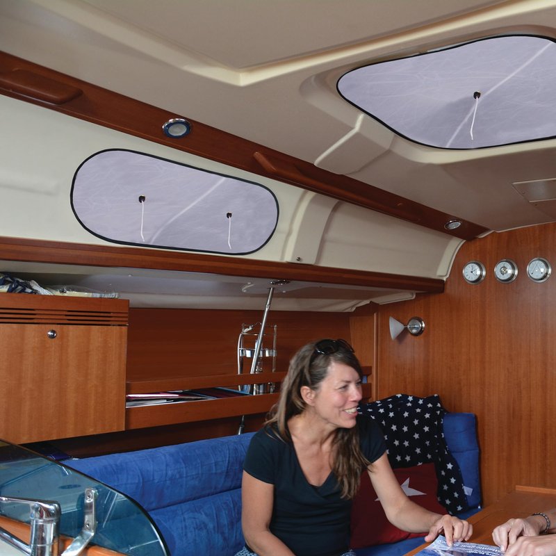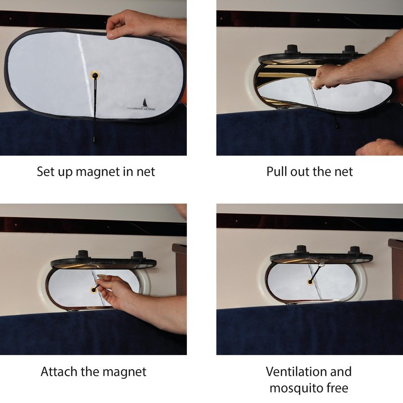 Waterline Designs blinds with ventilation are designed with the function to make it dark inside boats for a good night sleep and also ventilates the boat without letting in mosquitoes or other bugs. We believe that you need to have dark inside the boat to have a good sleep. Often, it’s dark when you go to bed, but the sunrise can be very early and wake you up. It’s easy to fall asleep on a boat and have pleasant dreams but you should be in charge of when you wake up. We have designed our blinds with ventilation as a three-layer product. Two layer of blackout material that are overlapped of each other by a few centimeter to still let air in and one-layer of dense mosquito net for keeping bugs out. The blinds work both on open and closed portlights. They mounts from the inside of the boat, so no one has to go outside even if the blind will be outside of the portlight when the portlight is open. Just attach a suction cup or a magnet (a metal plate is attached with double-sided tape on the window) on the portlight. The blind has a chromed steel frame (foldable) that stretches it out. The screen is tightened against the frame of the portlight by a cord attached to the suction cup / magnet. Done in a few seconds. After use the blind net can easily be folded down to a 1/3 of its size for storage. The blind only need to be bigger than the portlight opening. A portlight with opening <7⅞” x 25½” (200 x 650 mm) needs a screen 12” x 27” (300 x 700 mm). Since the screen is bigger than the hatch it’s also fits different shapes (square, elliptical, rectangular and round). Two sizes cover almost all standard portlights and brands. It’s easy to pick the right size. Blinds with ventilation for best sleep, good ventilation and mosquito free. You are worth a good sleep.