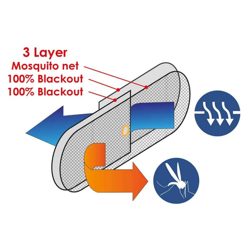 - THE PERFECT MIX - It features a 3-layer system that allows Mosquito net and 100% blackout in the same product. The combination of the two layers of curtain / blind and one layer of mosquito net darkens while letting air through and keeping the mosquitoes out of the boat.