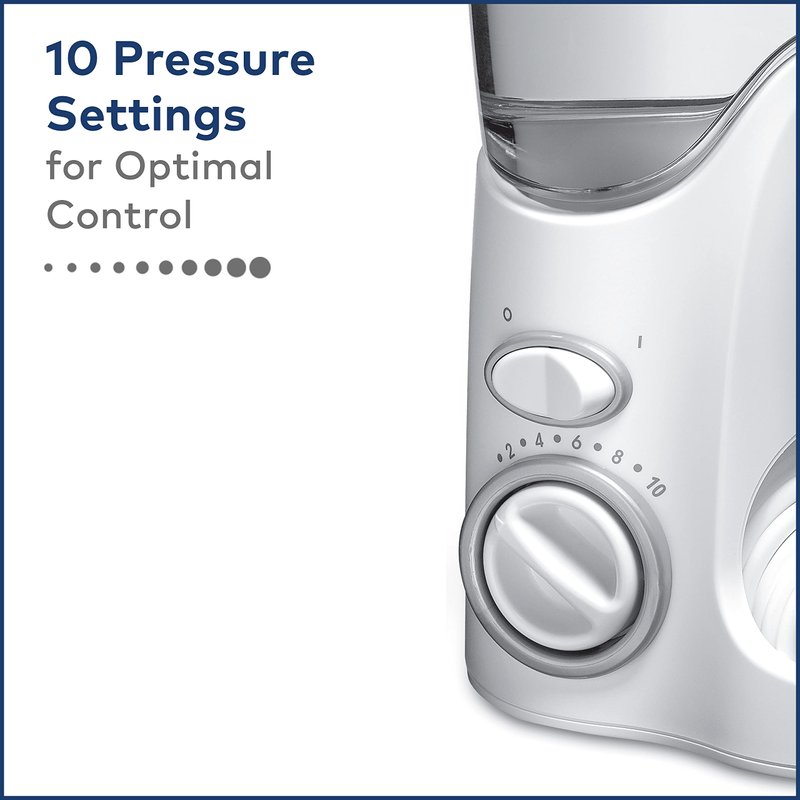 The Waterpik Ultra Countertop Water Flosser in White (WP-100) provides excellent water flossing performance. Tested and trusted, it is the first product in its class accepted by the American Dental Association (ADA). It cleans deep between teeth and below the gumline where traditional brushing and flossing can't reach, using a unique combination of water pressure and pulsations. And it's great for anyone with braces, implants, crowns, bridges, or periodontal pockets. The easy and most effective way to floss, the Waterpik Ultra Water Flosser features 10 pressure settings, a contemporary design, a covered reservoir with in-lid tip storage, and water On/Off switch built into the handle to easily control water flow.