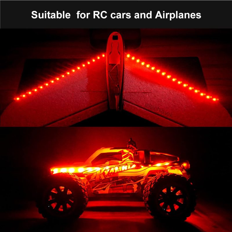 The light strips are suitable for RC cars, trucks, Airplanes, boats drones and fixed-wing like AR Wing, Skyhunter, ZOHD Talon etc. Covered thickened transparent heat shrinkable tube makes the light strips waterproof and durable. it is water resistant, hit resistant and wear resistant. The LED strips are super bright. It can be mount under chassis as underglow lights or mount inside the body case of RC cars. The total length of 1 meter (39.4inch) light strip is almost suitable for all size of RC cars or airplanes