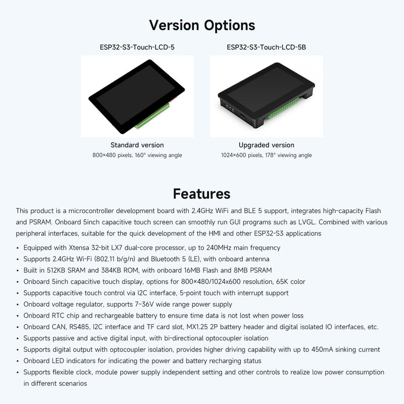 - Built in 512KB SRAM and 384KB ROM, with onboard 16MB Flash and 8MB PSRAM Onboard 5inch capacitive touch display, options for 800×480/1024x600 resolution, 65K color