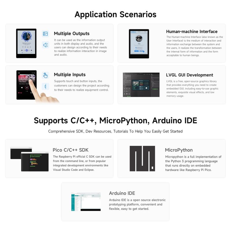 - Easy Development & Programming: The RP2350-Touch-LCD-2.8 supports drag-and-drop programming via mass storage over USB, simplifying development and making it accessible to both beginners and advanced users. The onboard speaker adds an extra layer of functionality for multimedia applications.