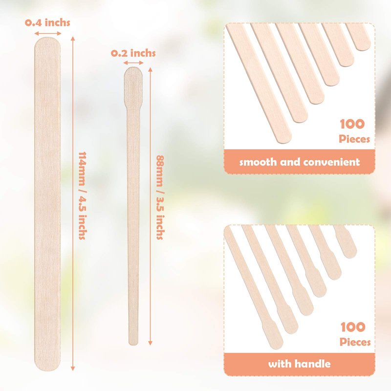 - 2 Sizes of wood spatulas applicator: the small wooden waxing stick is about 3.5 inches in length, ideal size for waxing eyebrows, the large wax application stick is approx. 4.5 inches long, which is more suitable for waxing general areas, the 2 sizes can meet your different needs