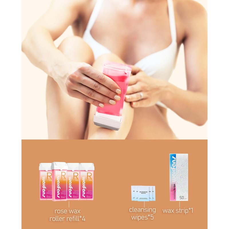 - Roll on wax kit includes :4 Rose Roll on Wax Refill ,5 Clean oil bag,50 Non Woven Waxing Strips