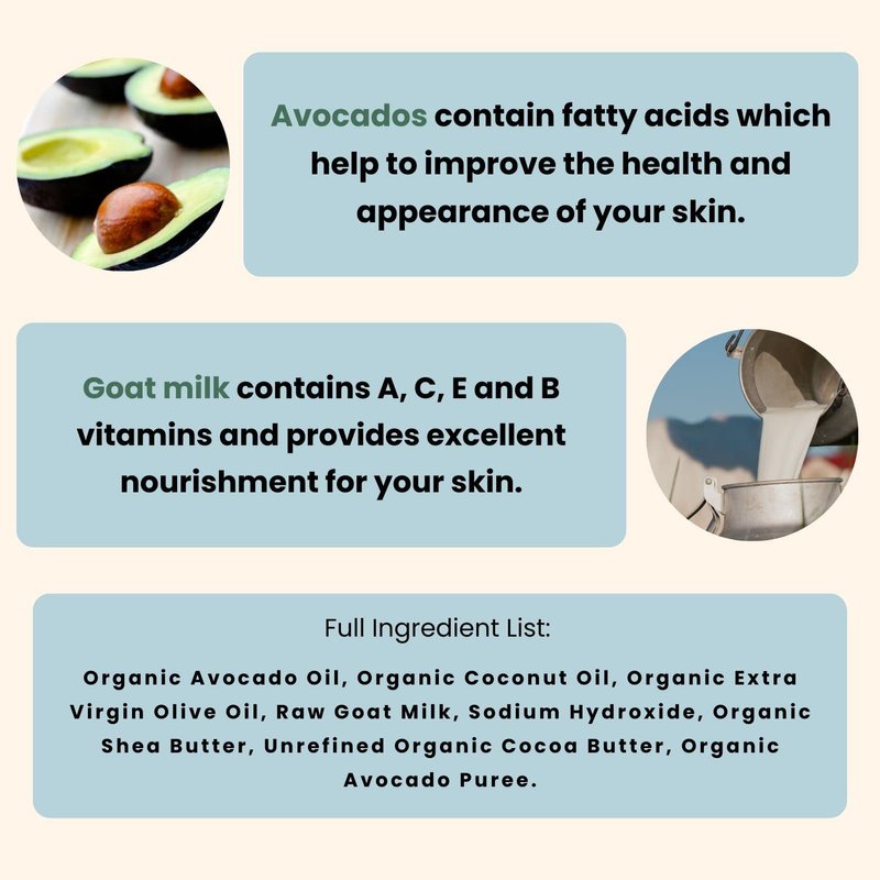 - HIGHLY MOISTURIZING: While other soaps use harsh detergents that can strip the skin of its moisture, our goats milk soap contains high-fat avocado oil for skin nourishment.