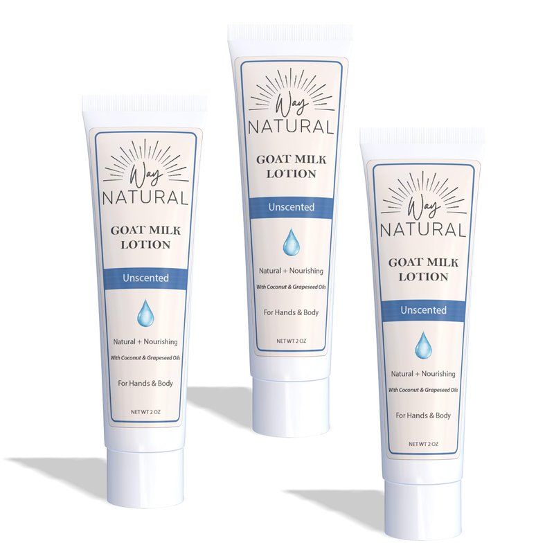 Way Natural Real Goat Milk Lotion, Travel Size, Bulk - Soothing, Creamy, Dry Skin Relief - Coconut & Grapeseed Oils - Goat Milk Hand Cream/Body Lotion - Unscented, 3 (2oz) Tubes