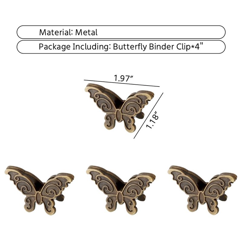 This receipt holder is made of sturdy metal that won't break, damage, fade, and stand up to frequent use. The receipt holder adopts thickened spring, strong grip and good elasticity, which can hold anything you want firmly. Rounded corners and smooth surface, no sharp edges or burrs, won't scratch your hands. Feature - Material: Metal - Size: 1.97x1.18 Inch - This binder is a reusable, flexible, and practical accessory for various occasions, such as home, study room, office, school, classroom, dorm, library, store, and even travel. - Metal decorative clips are perfect gifts for teachers, students, writers, painters, artists, designers, planners, office workers, travelers, and more. Package Including Butterfly Binder Clip*4