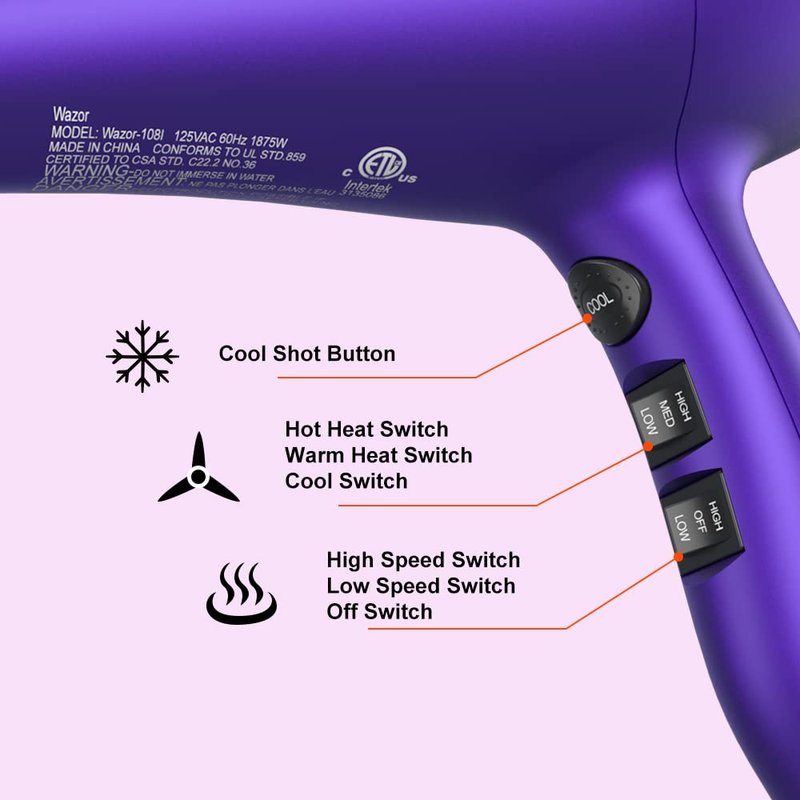 Wazor 3rd Generation Lightweight Low Noise Hair Dryer,( 1875W Tourmaline Ceramic Negative Ionic Blow Dryer)2 Speed 3 Heat Settings Cool Shot with Diffuser Concentrator(Purple)