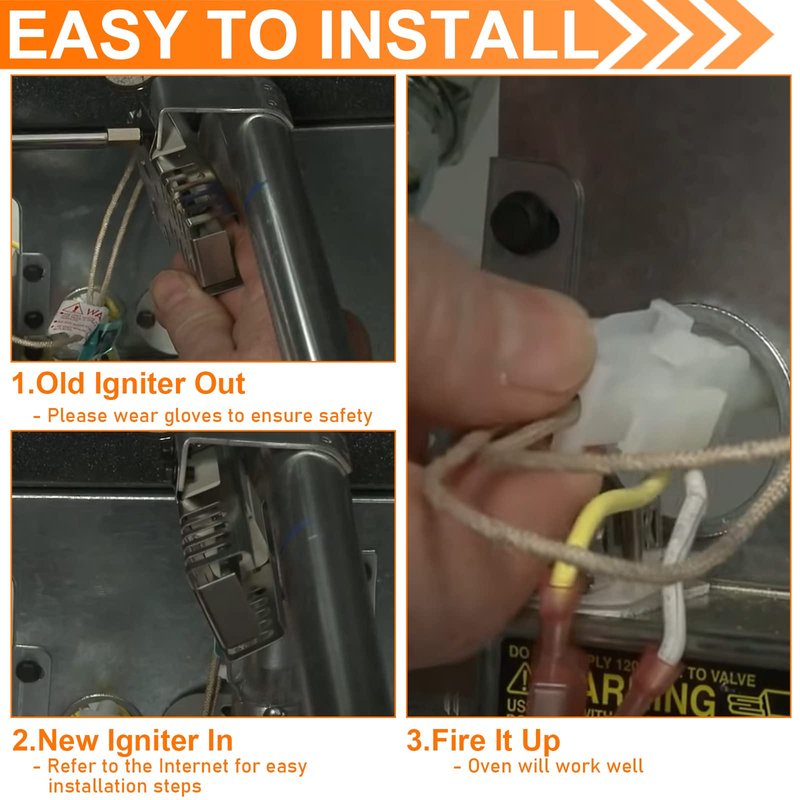 - EASY TO REPLACE: It takes only a few minutes to intall the igniter. Just remove the old igniter and reconnect the our new igniter. The wire connections may be different. You can cut and splice the wires using the porcelain wire connectors included with oven igniter. 🛠Please unplug the range before installing WB13K21 oven igniter.