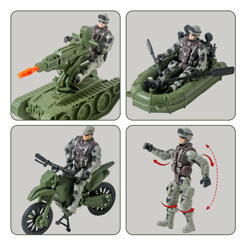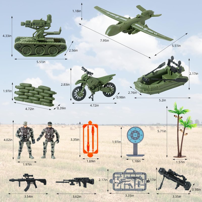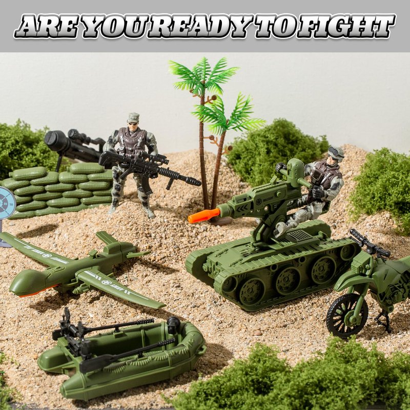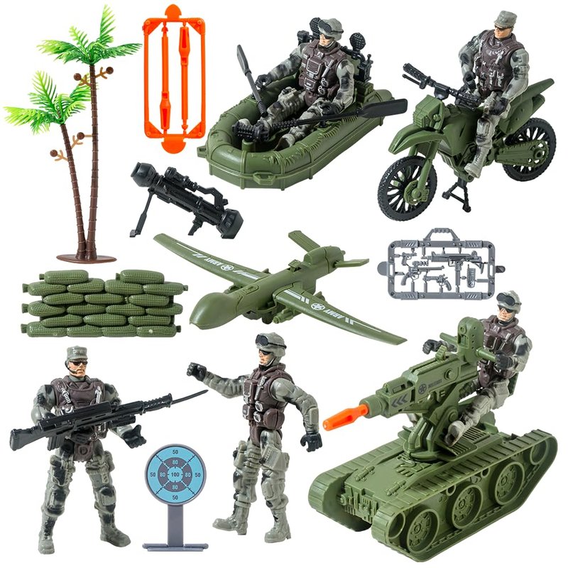 - 15-in-1 Army Men Playset Includes: This all-inclusive army action figures for boys, featuring 1 rubber boat/1 tank/1 drone/1 gun piece/1 small gun/1 target/2 pistols/2 orange bullets/1 green sandbags/2 military figures/1 motorcycle/1 tree