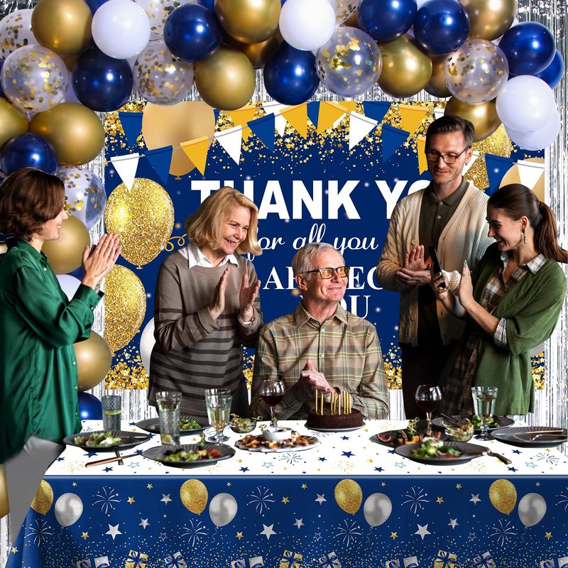 - 🎉We Appreciate You Decorations: Our Party pack included a THANK YOU for all you do WE APPRECIATE YOU backdrop banner, blue and gold table cover, 1 pack Foil Fringe Curtains,20pcs gold Latex balloons, 20 blue latex balloons, 10 white latex balloons, 12pcs gold confetti balloons, 10 meters ribbon and a straw.