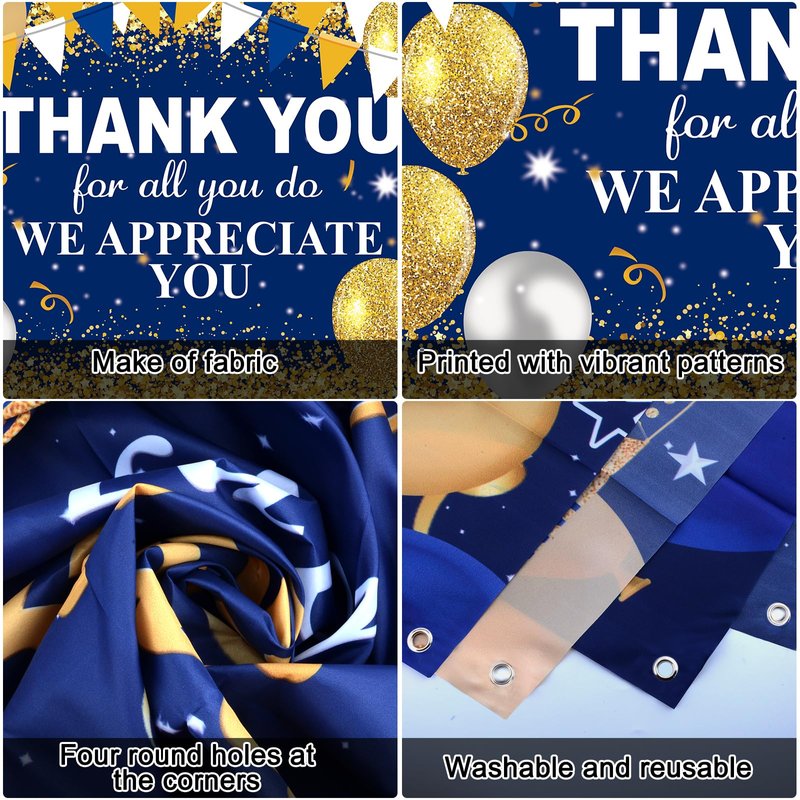 - 🎉High Quality Thank You Decorations for Employees: Thank you party decorations are made of premium Aluminium Foil material, thicken, non-toxic and eco-friendly. Our thank you party balloons are easy to inflate and, support both air and helium. Note: Please do not inflate too much air be careful with how much pressure with helium. The banner is made of durable polyester fabric, very nice with pretty blue gold colors, sturdy and reusable.