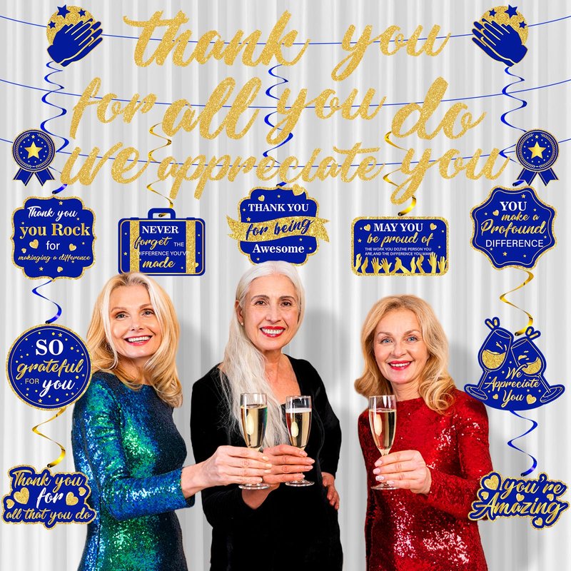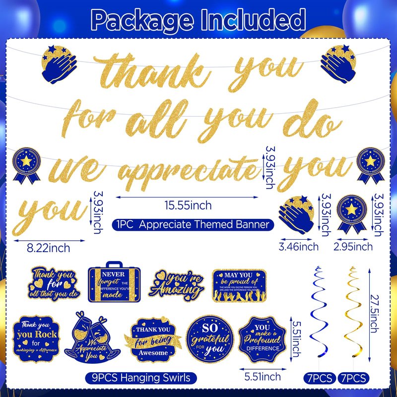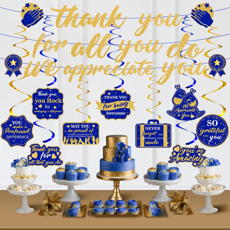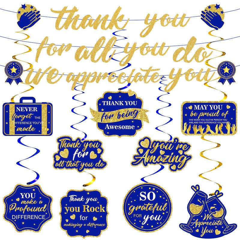 - 【What You Will Get】: The navy blue gold we appreciate you decorations set includes 1 piece of blue gold Thank You For All You Do we appreciate you banner, 9 pieces of blue gold appreciate hanging swirls, combine blue gold with thank You themed elements, It is great ideal for your different kinds of appreciation, office celebrations, retirement and graduation parties.