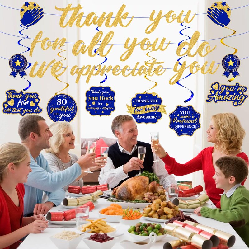 - 【High Quality Material】This navy blue gold Thank You For All You Do appreciation banner are made of thick cardboard, the appreciation themed hanging swirls is made of quality metallic foil and cardstock these Thank You theme decorations are sturdy and durable, non-toxic, no odor, not easy to break, tear or deform, keep standing on a level platform for long-term service