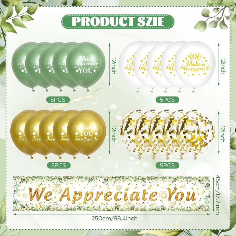 - 🎊Complete Thank You Set: This pack includes 1 large sage green we appreciate you banner measuring 98 x 18 inches and comes with 18pcs 12inch latex balloons with appreciate patterns. Elevate your gratitude with our We appreciate you banner set