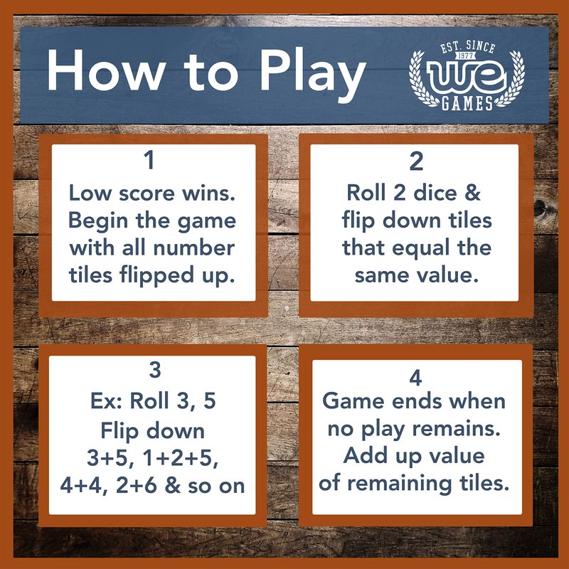 - LET'S PLAY: Lay down any numerical combination of tiles that match your roll. Keep on rolling until you can not match your roll on the tiles. The lowest score wins. Lay down all the tiles to win.