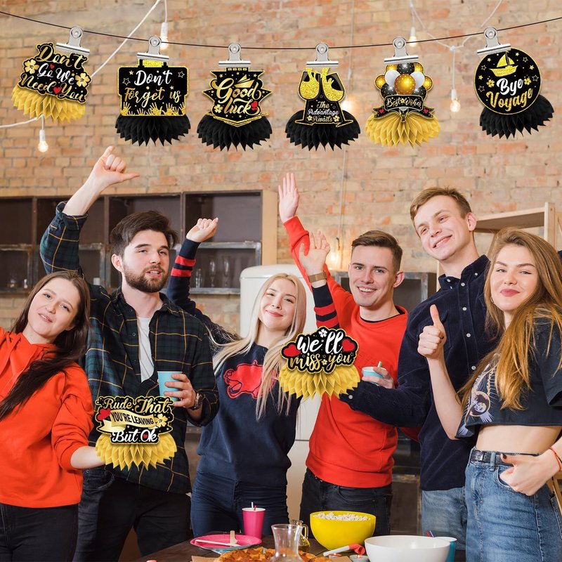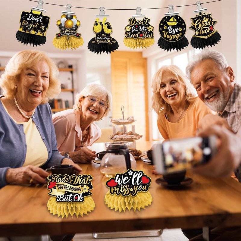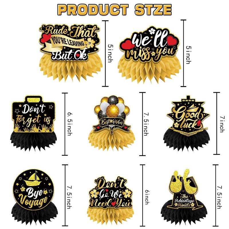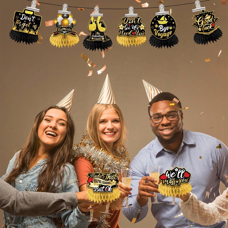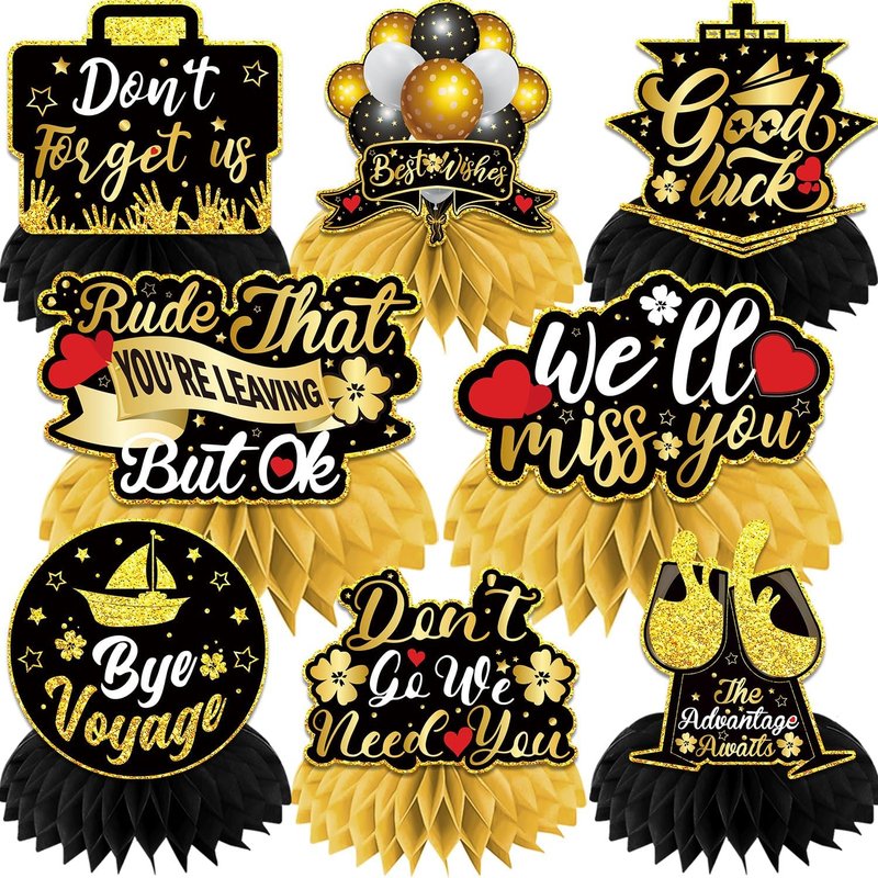 - package contains: the retirement party decorations come with 8-piece 3d retirement centerpieces for tables each with a different style, including "we will miss you", "good luck", "don't go we need you", "who said you could leave" and other words to express nostalgia. it is the ideal decoration for farewell party, allowing you to spend happy time with your families and friends before parting.this honeycomb centerpieces set is like no other and will have people loving your farewell party decorati