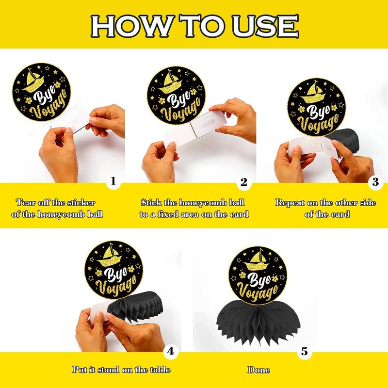 - simple to assemble: these going away party decorations honeycomb centerpieces can be assembled according to the pictures in just a few seconds, and then put in your favorite display area to easily decorate your party, saving time and effort. add some atmosphere by setting these going away decorations in the middle of the table and these cool black and gold decorations are impressive enough to be noticed