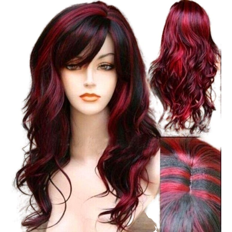 WeAlake Long Hair Wigs Wavy Curly 24" Glamorous Women Black Red Highlights Synthetic Cosplay Daily Party Clothing Wig with Wig Cap