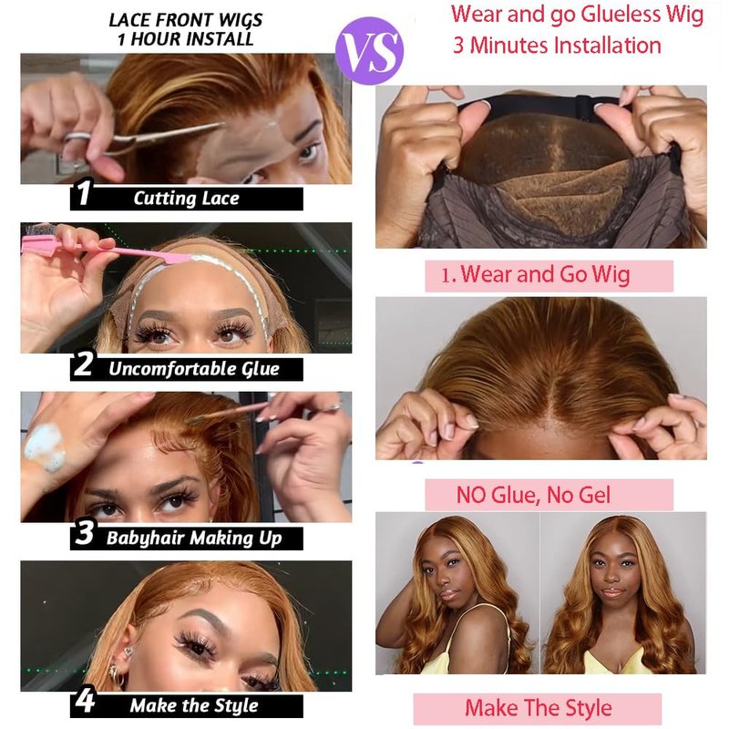 - Wear and Go Glueless Wig for Beginners:Our Glueless Wigs Human Hair Used Pre Cut Lace,No Glue,No Gel,No Skills Needed, Only Takes 3 Seconds to Wear and 1 Second to Take Off! Easy , Quick and Convenient, Beginners Friendly ,Just Wear & Go!