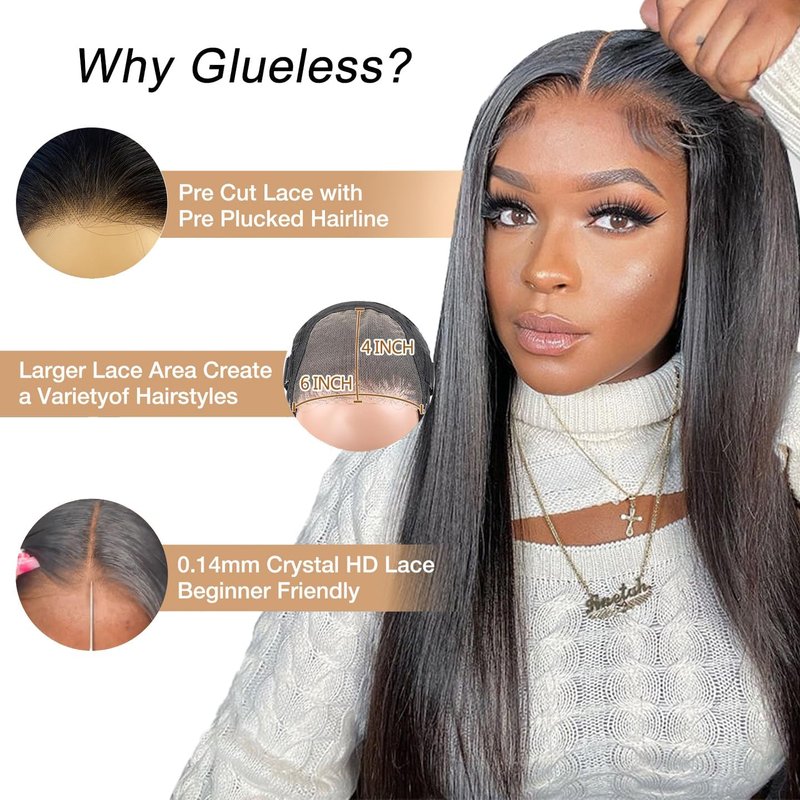 - 【Wear and Go Glueless Wig Advantages】 3 Seconds Install Glueless Wigs! 6x4 Glueless Straight Lace Human Hair Wig Pre Cut Pre Plucked Natural Hairline. No Glue, No Gel, Protect You Skin. No Skill Required, Just Wear&Go! Save Your Time, Beginner Friendly.